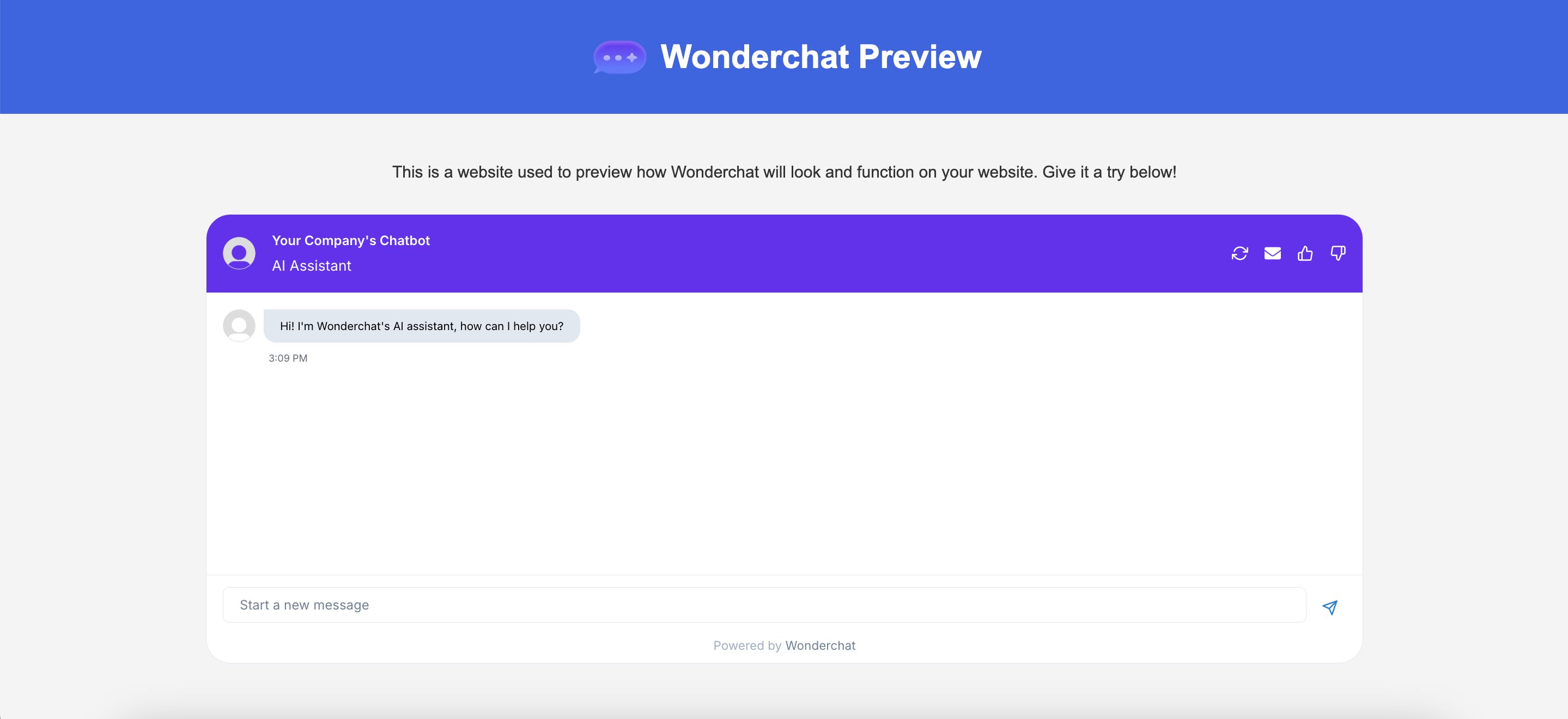 <figure><img src="https://3760420285-files.gitbook.io/~/files/v0/b/gitbook-x-prod.appspot.com/o/spaces%2F0WUvfmkdMPXz3x7NXP8i%2Fuploads%2Fgit-blob-c9f2bc9d457a3b4a42891acddbda428a68323982%2Fimage.png?alt=media" alt=""><figcaption><p>In a new window, you'll see the preview of the chatbot</p></figcaption></figure>