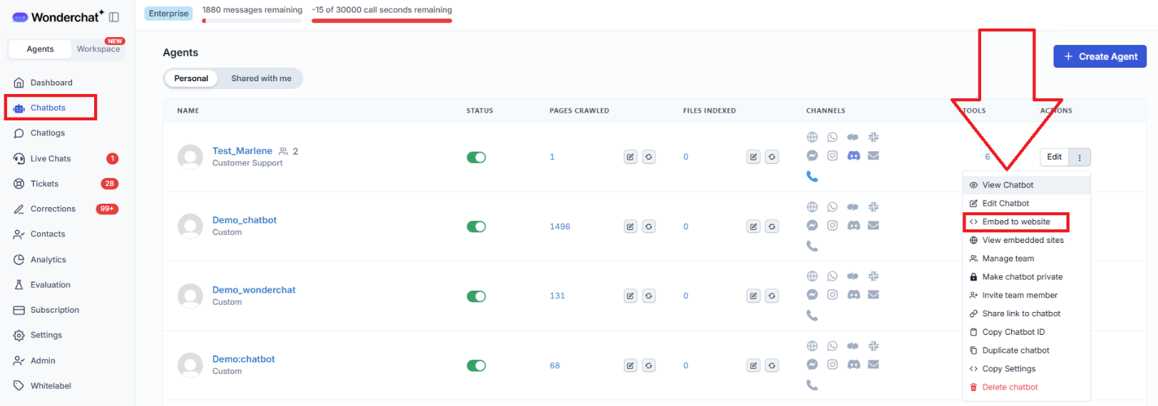 Go to **"Chatbots"** and under actions, click on the **“⋮”** and go to **“Embed to website”**